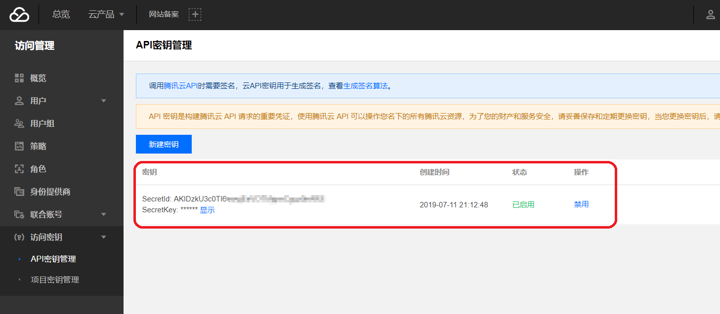 2、进入“云API密钥”管理界面,您将看到您的API密钥列表,API密钥由SecretId及SecretKey组成,如果该列表为空,请点击“新建密钥”创建一个;